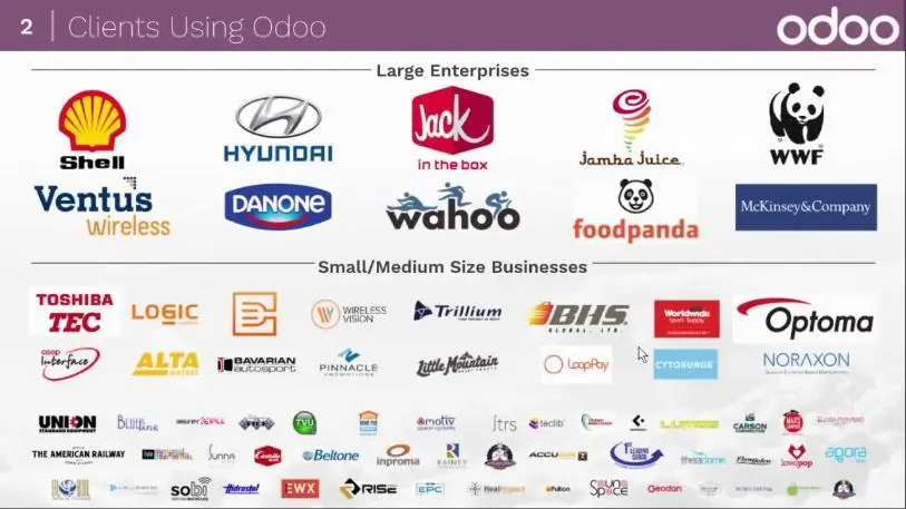 • Apps: Accounting, Sales, Purchasing, Inventory, CRM, Project